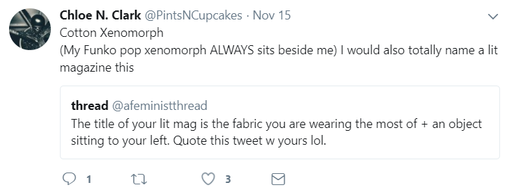 Cotton Xenomorph is a literary journal produced with the mission to showcase written and visual art while reducing language of oppression in our community. We are dedicated to uplifting new and established voices while engaging in thoughtful conversation around social justice.